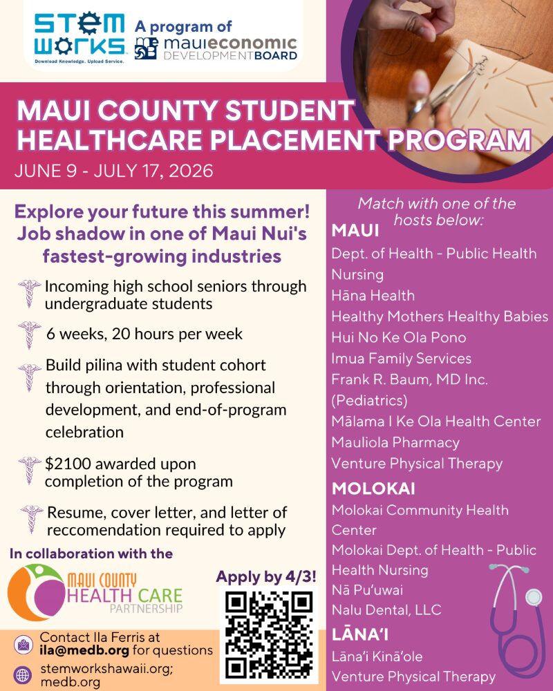 Maui Economic Development Board’s STEMworks™ program is expanding its summer internship programs with the new Healthcare Student Placement Program from June 9 – July 17, 2026. This paid job shadowing opportunity in healthcare is exclusively for Maui County students.